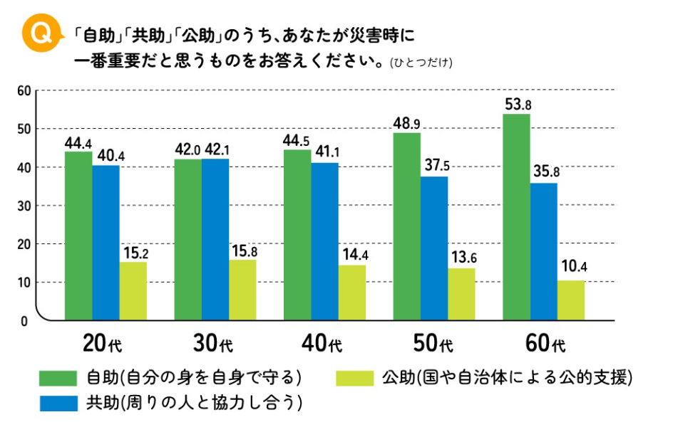 「自助」「共助」「公助」のうち、あなたが災害時に一番重要だと思うものは何か、という質問に対して、全体的に「共助」より「自助」を重要だと考える割合が多くなった。