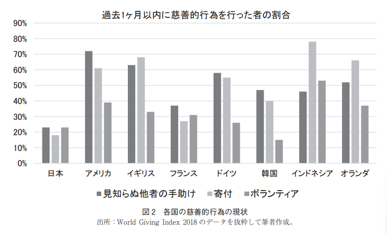 各国で「過去1ヶ月以内に慈善的行為を行った者の割合」という意識調査を行った結果、全ての項目で日本が圧倒的に低い結果となった。