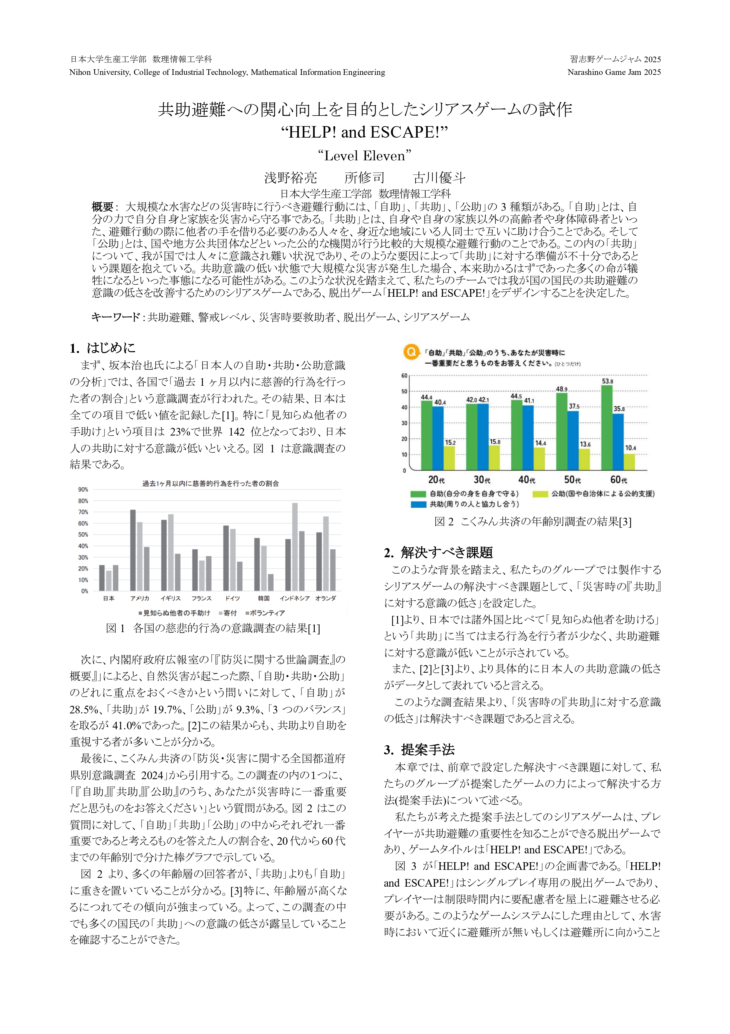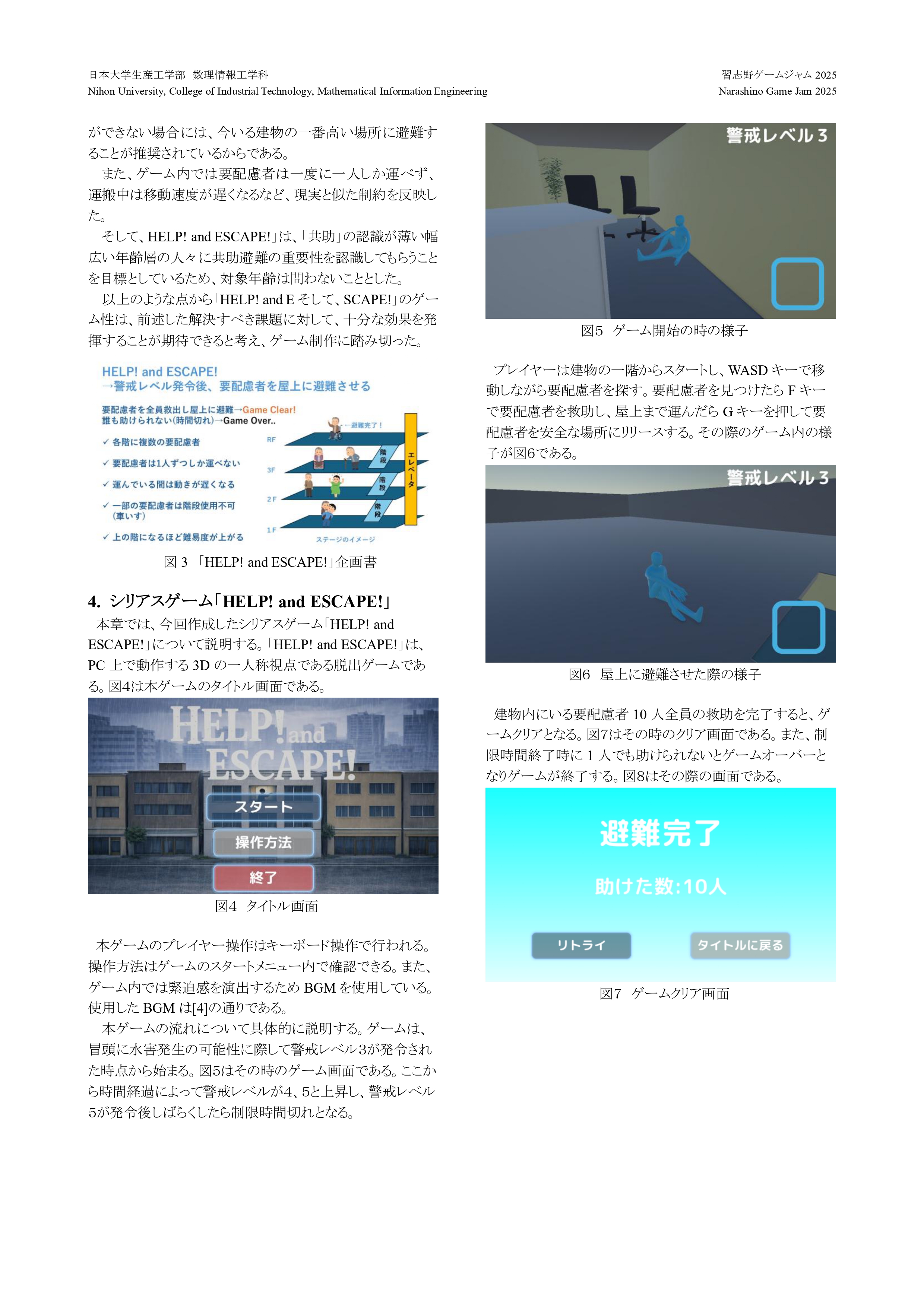 脱出ゲームというゲームシステムで、プレイヤーが楽しみながら共助避難について知ることができるゲーム制作を目標とする。